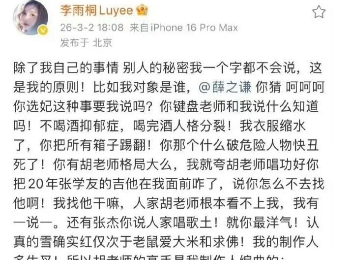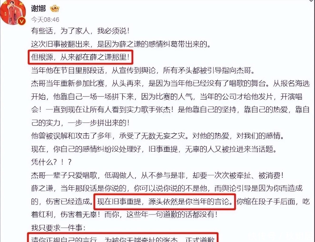 她以强硬姿态要求薛之谦就当年言论向张杰致歉,并敦促其妥善处理私人事务,避免波及无关人士。