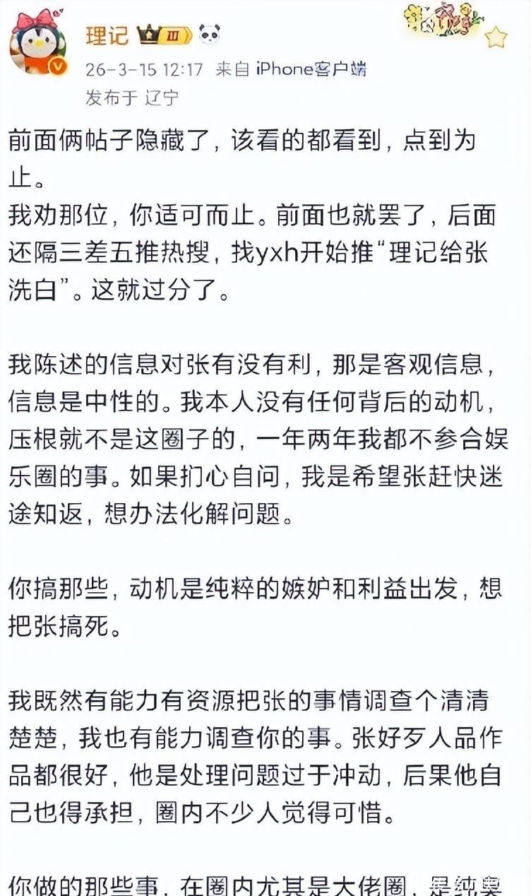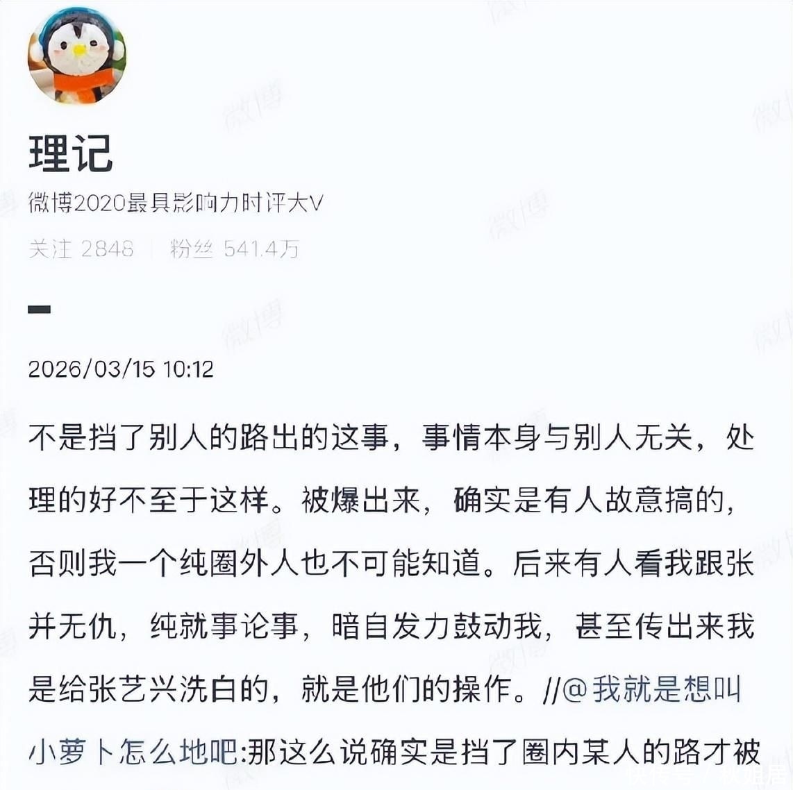 3月15日,“理记”以视频形式公开回应,直言张艺兴实为他人转移视线的“战略支点”,自身并非主动发起攻击;